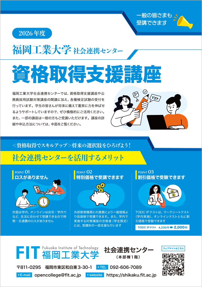 2026年度資格取得支援講座の受講生募集中です。 社会連携センターでは、地域・社会貢献や他大学との学生交流など学習に繋がる課外活動を支援するとともに、スキルアップのための資格取得支援講座を提供しています。講座の一部は、地域の皆さまにもご受講いただけます。 下記の資格取得支援講座リーフレットをご覧いただき、興味のある講座がございましたら、社会連携センターまでお問い合わせください。