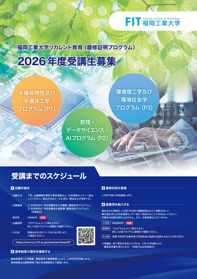 福岡工業大学では、地域に根差した高等教育機関として、本学が持つ教育リソースや専門的な知見を地域・社会に還元するため、社会人を対象としたリカレント教育(履修証明プログラム)を提供しております。